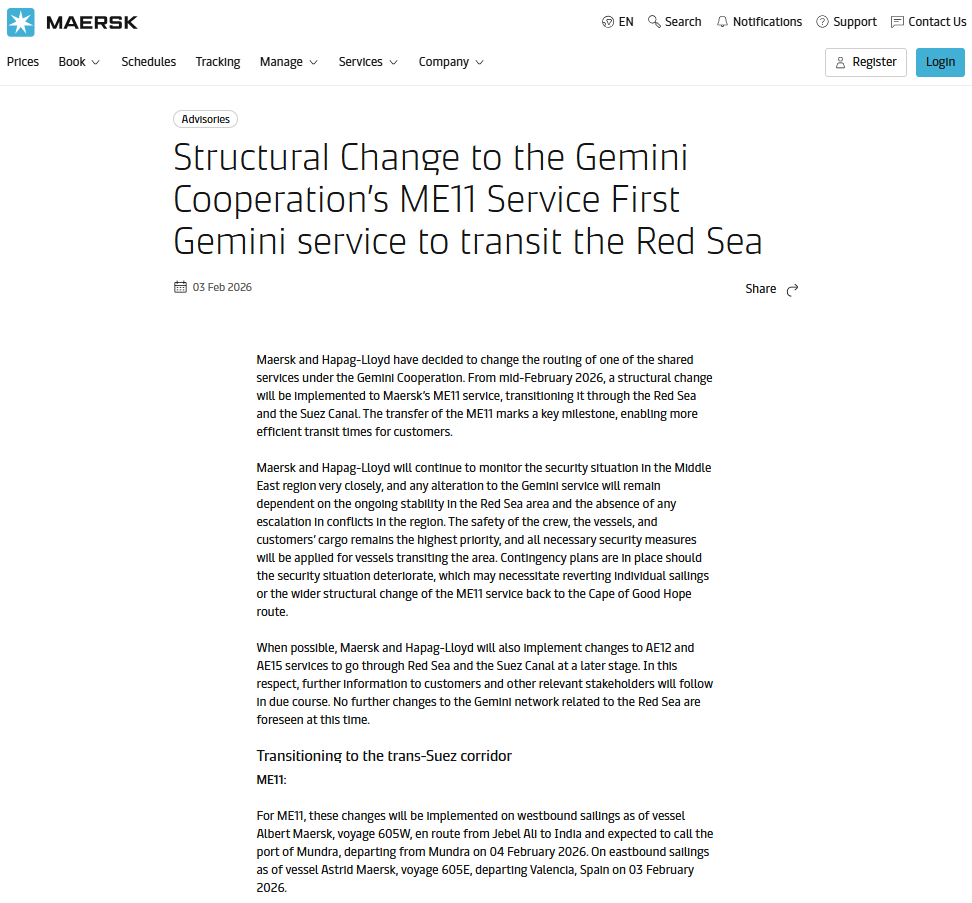 官宣:马士基+赫伯罗特,首次结构性回归红海航线