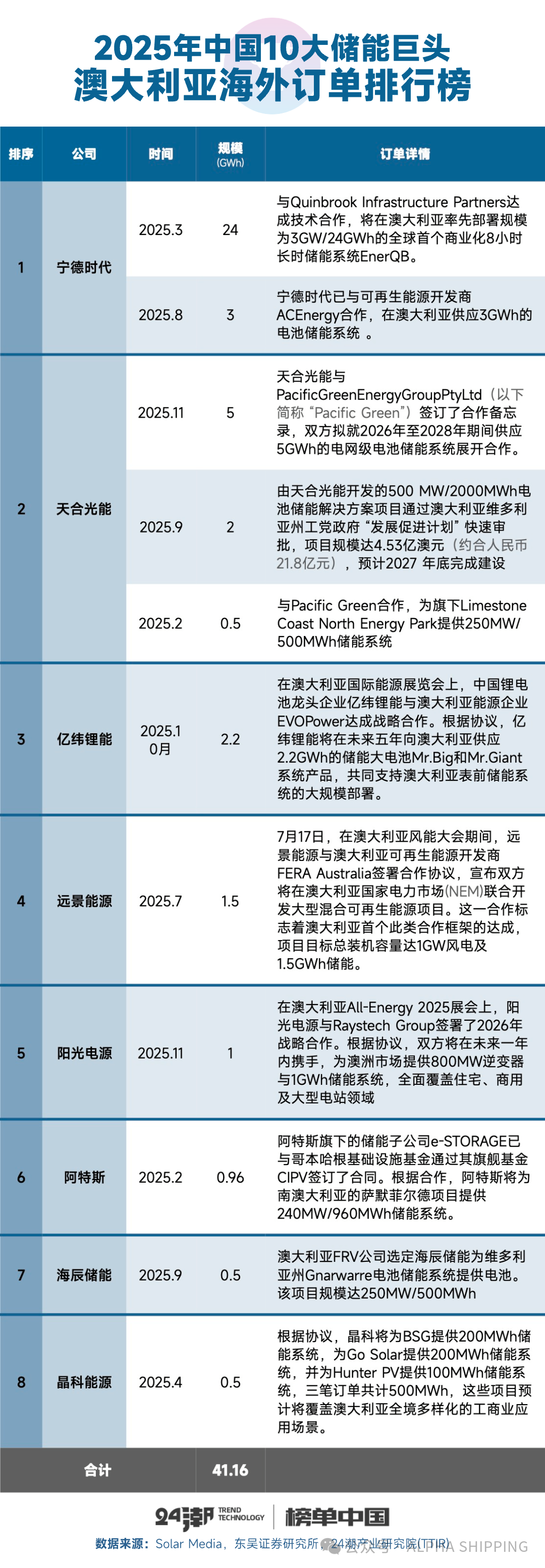 另外,根据24潮产业研究院(TTIR)的不完全统计,2025年至今,10大储能巨头签订海外订单总规模合计达166.26GWh,而这已经是2024年海外新型储能市场新增装机量(81.5GWh)的2.04倍。这些"GWh级"订单的持续涌现,标志着中国储能企业已经从单纯的产品输出者转变为全球储能市场规则的重要制定者。
